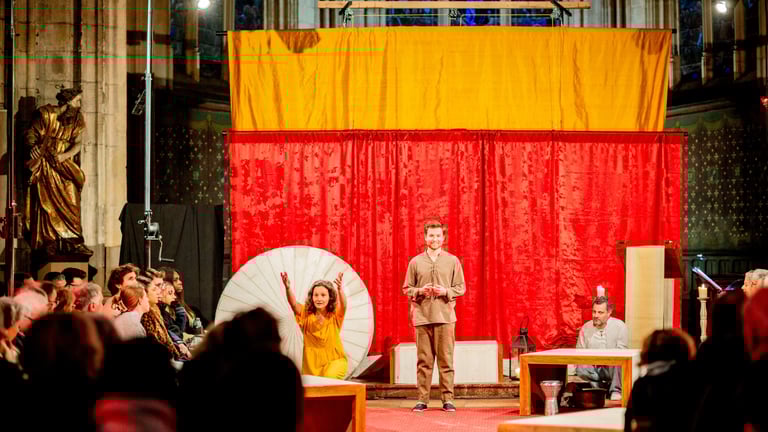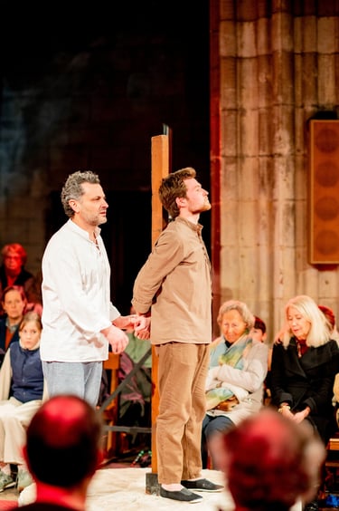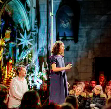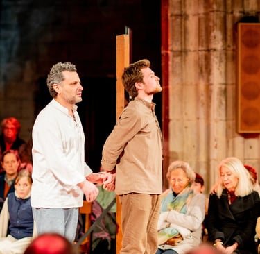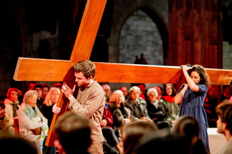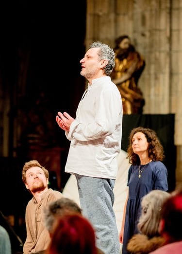 Des témoins vont donc raconter l’Évangile de Jean, en adressant le récit aux spectateurs. En retrouvant la tradition des mystères médiévaux, ce spectacle donne à voir les rencontres du Christ avec les hommes et les femmes de l’Évangile. Ainsi la Parole s’incarne, elle devient palpable, accessible, concrète.