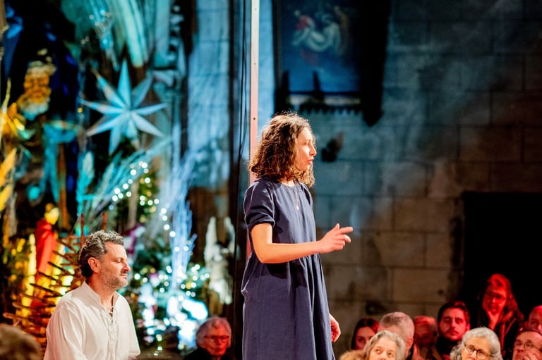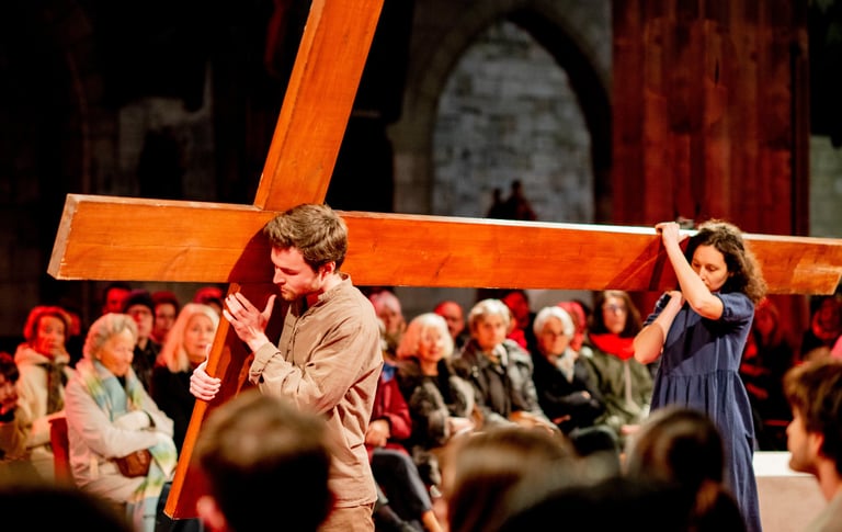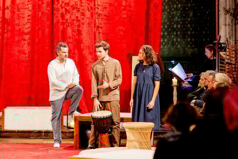 Des témoins vont donc raconter l’Évangile de Jean, en adressant le récit aux spectateurs. En retrouvant la tradition des mystères médiévaux, ce spectacle donne à voir les rencontres du Christ avec les hommes et les femmes de l’Évangile. Ainsi la Parole s’incarne, elle devient palpable, accessible, concrète.